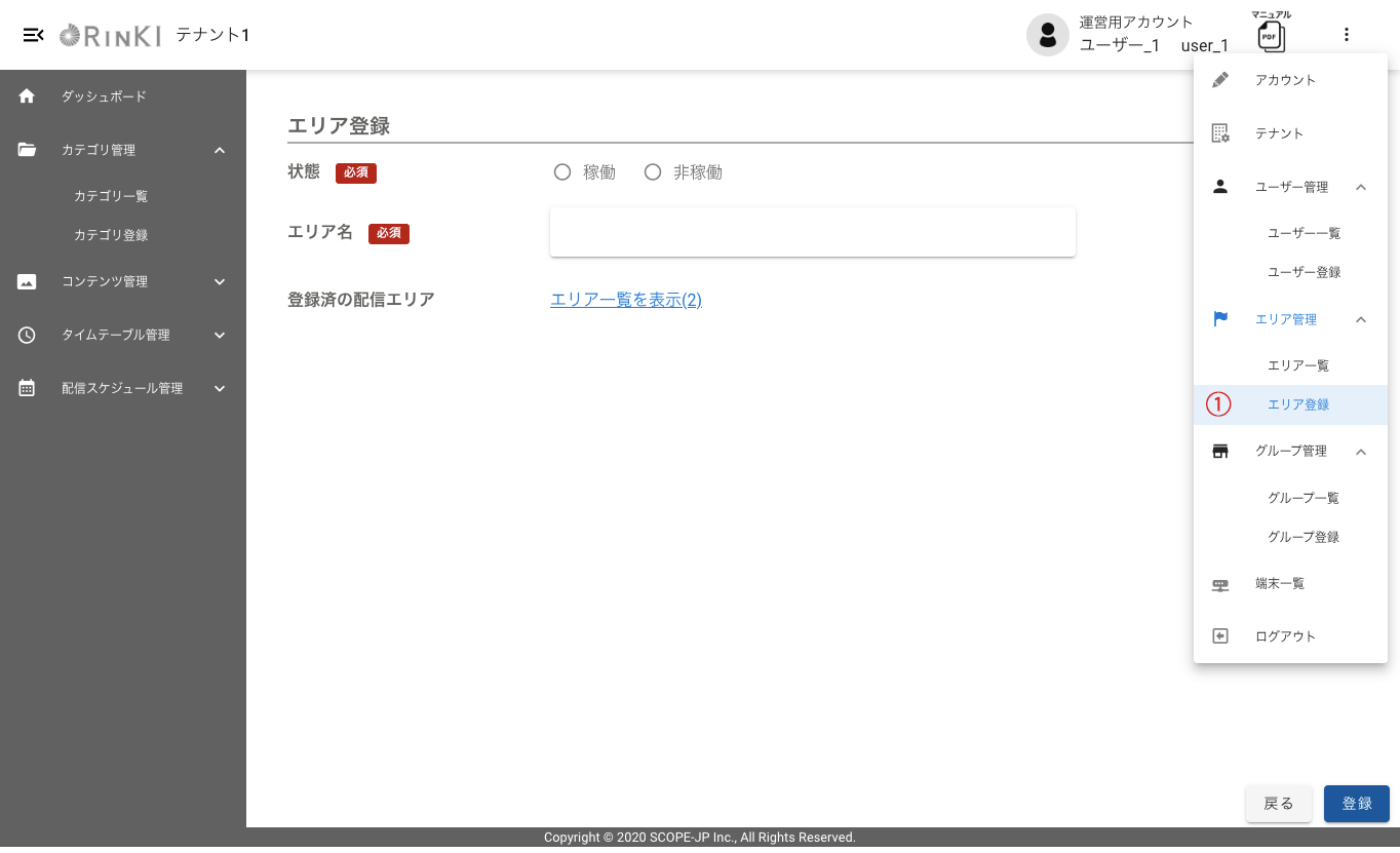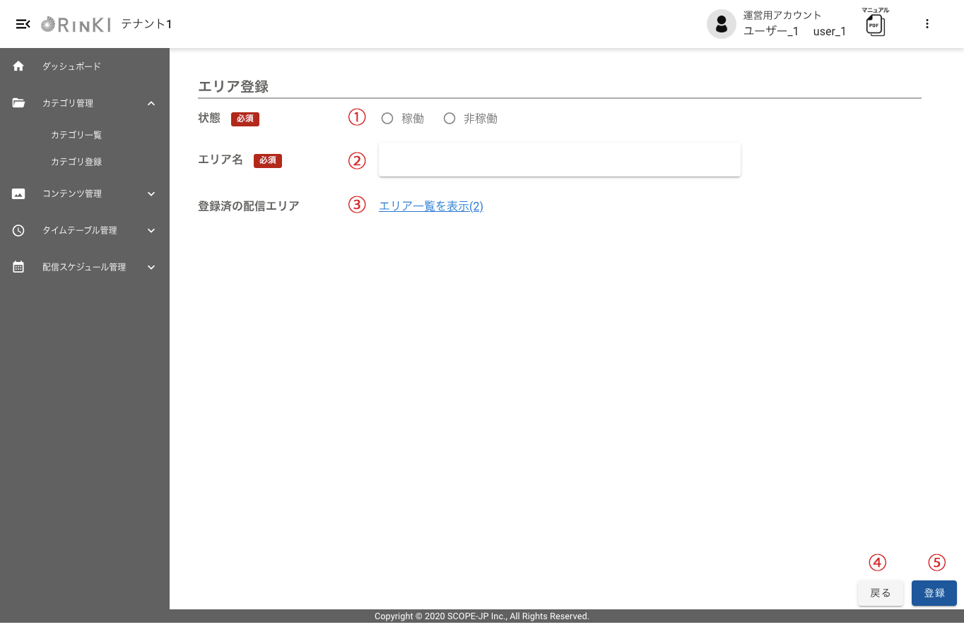 | ① | エリア登録 | ボタン | エリア登録に遷移します |