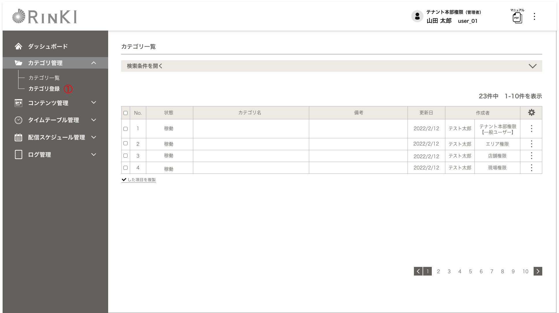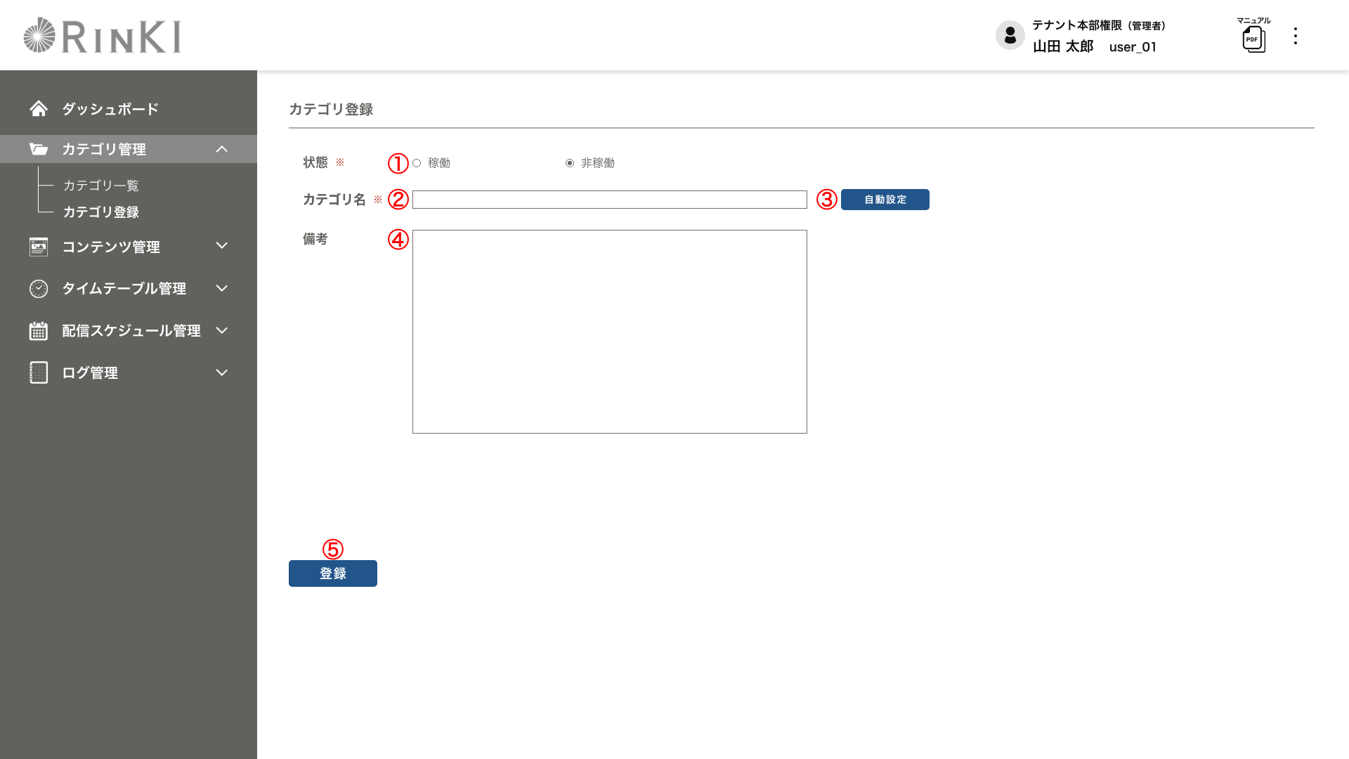 | ① | カテゴリ登録 | ボタン | カテゴリ登録に遷移します |