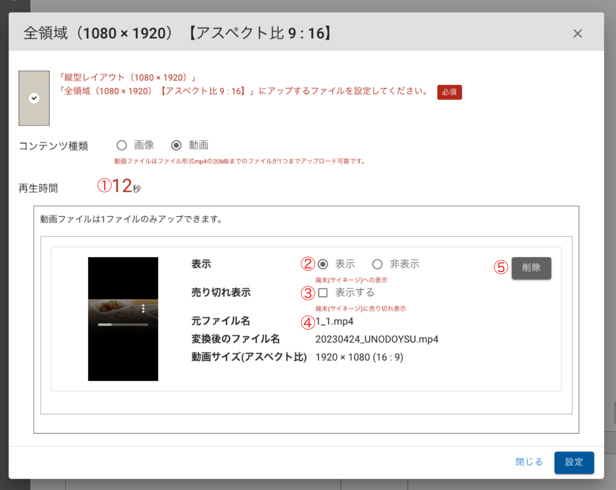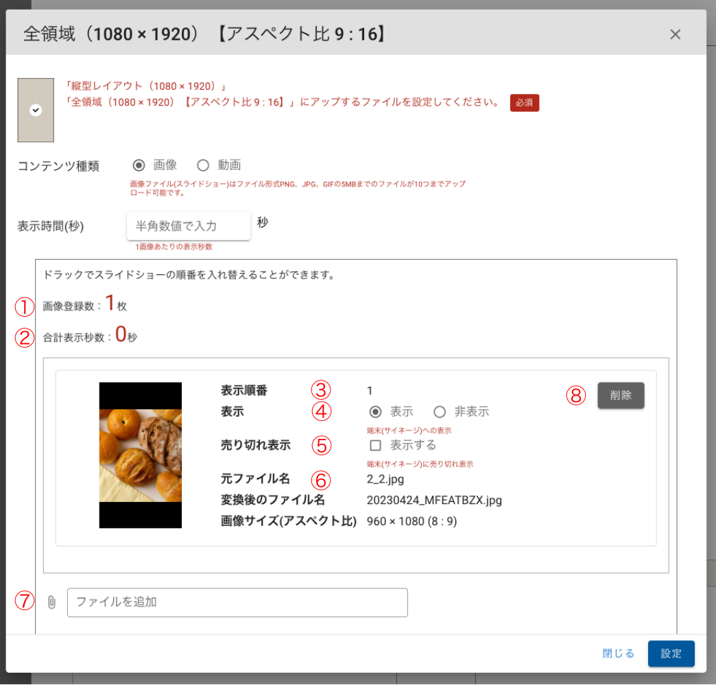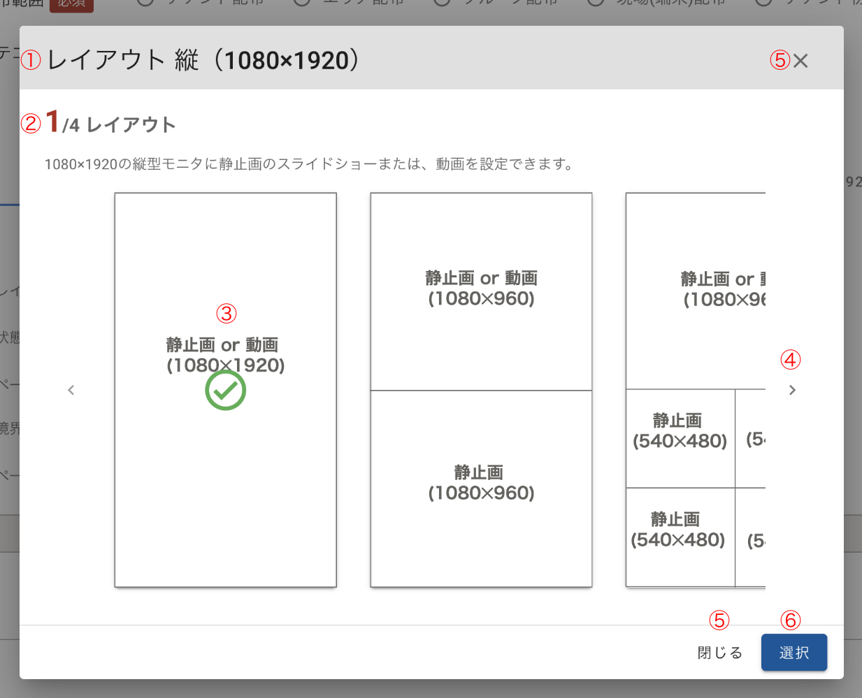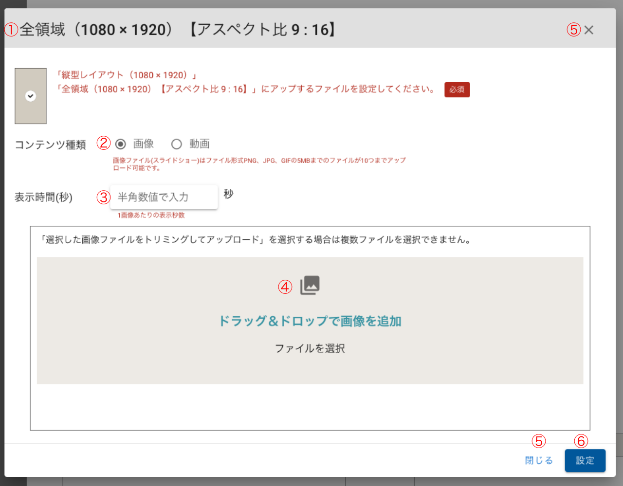 | ⑥ | ディスプレイ選択 | ラジオボタン | 縦型と横型の設定をタブで切り替え 0:縦(1080 × 1920) 1:横(1920 × 1080) |