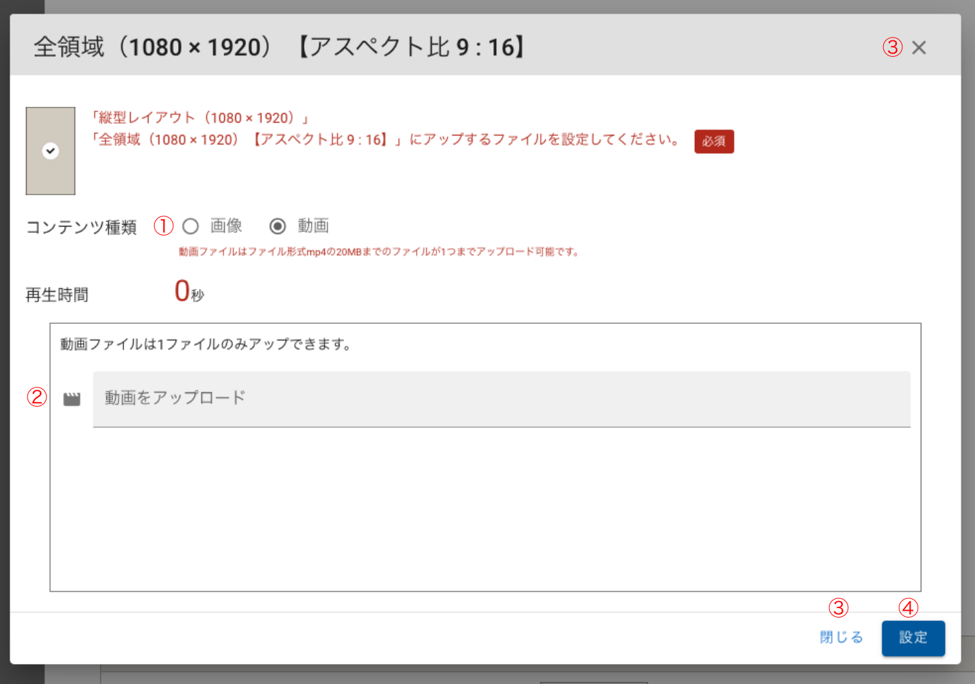 | ② | 動画をアップロード | ファイル添付 | クリックで、アップロードファイルを選択し添付する | |