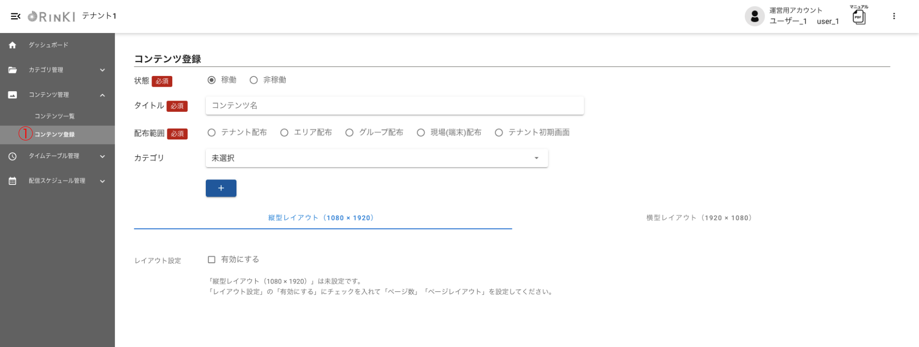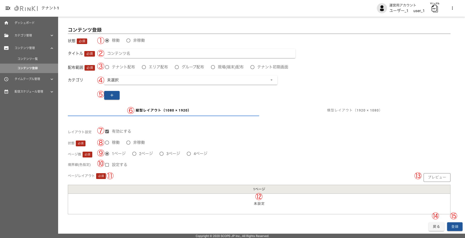 | ① | コンテンツ登録 | ボタン | コンテンツ登録に遷移します |