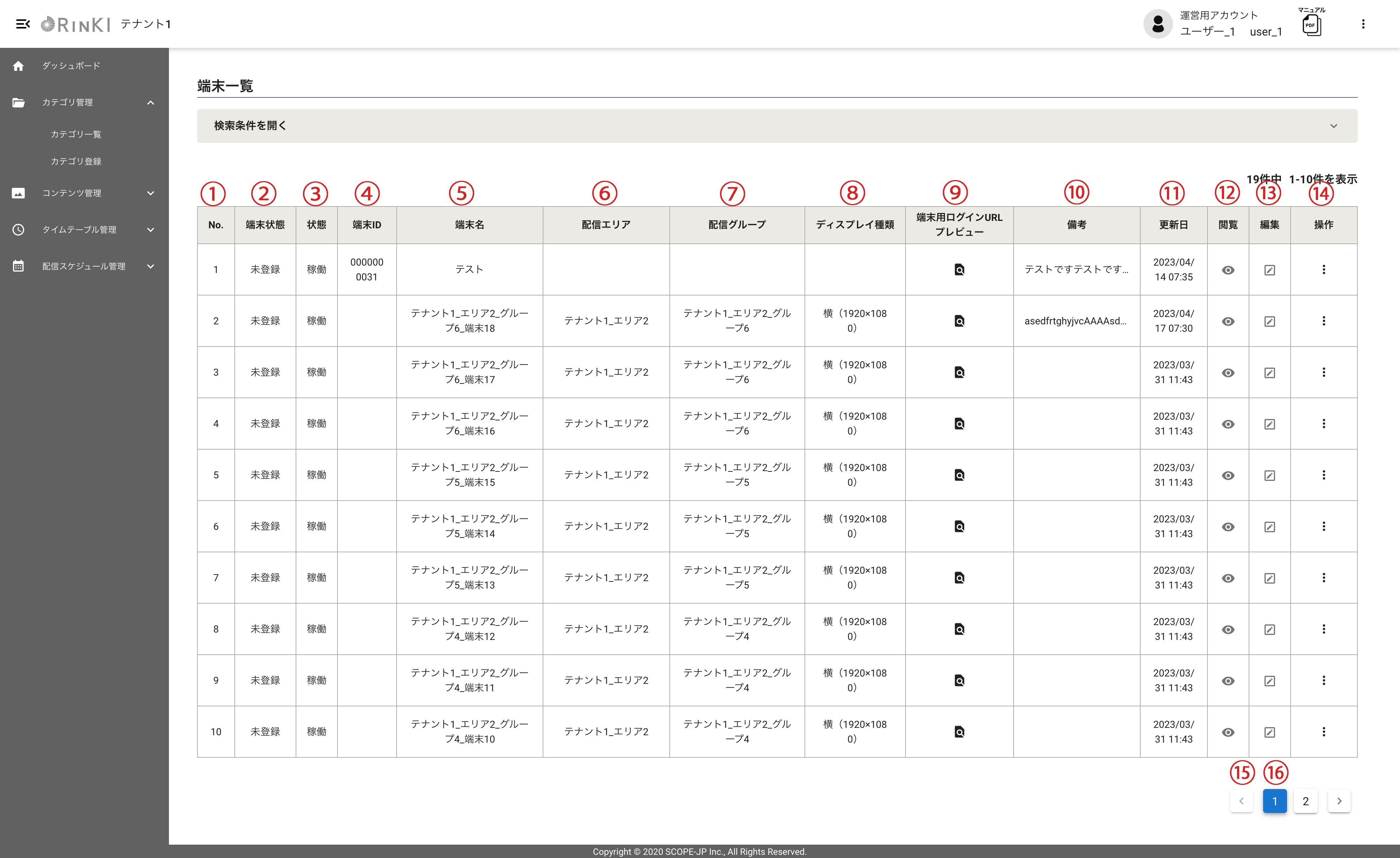 ・自身の端末は文字が灰色で表示 ・削除:運営者管理画面のみ可能 |