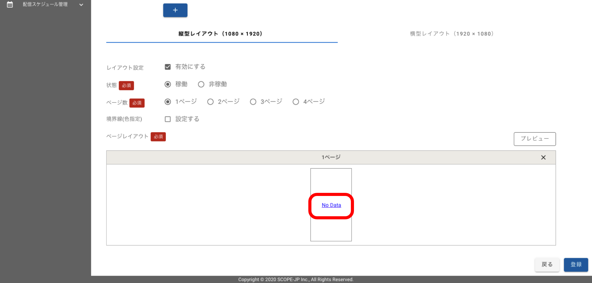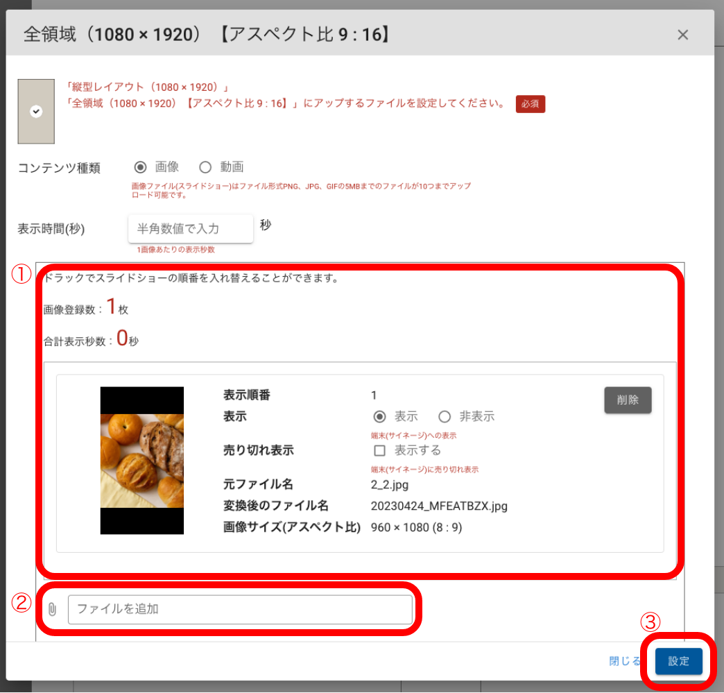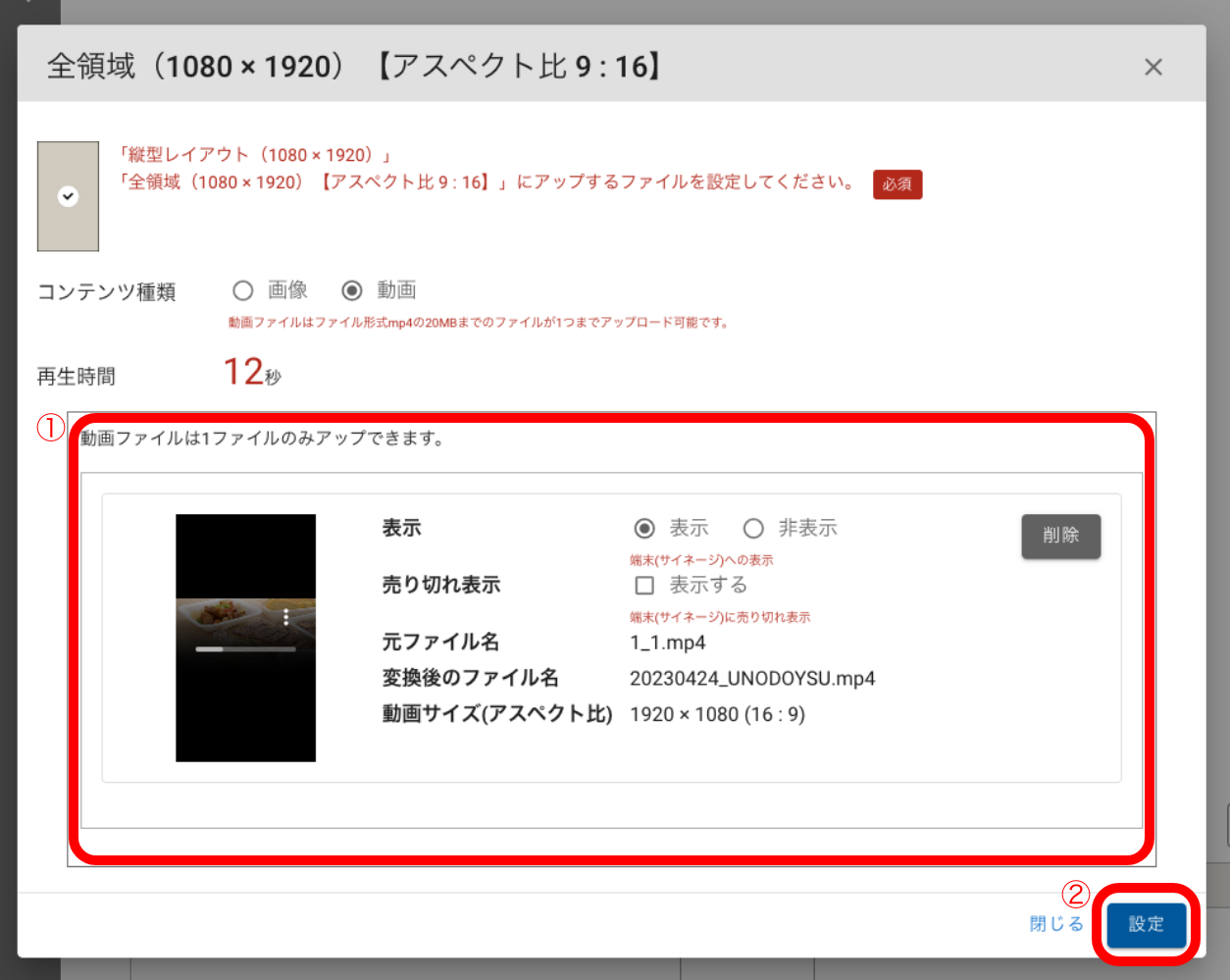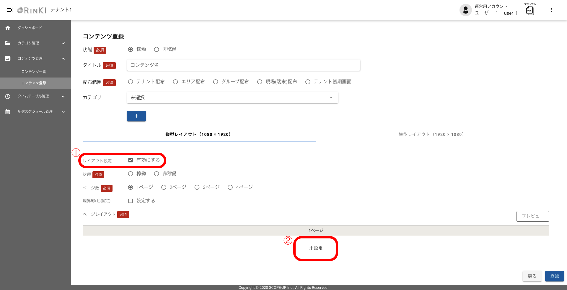 - ①:【縦型レイアウト(1080 × 1920)】と【横型レイアウト(1920 × 1080)】の「レイアウト設定:有効にする」にチェックを入れると、レイアウトの詳細を設定できます。