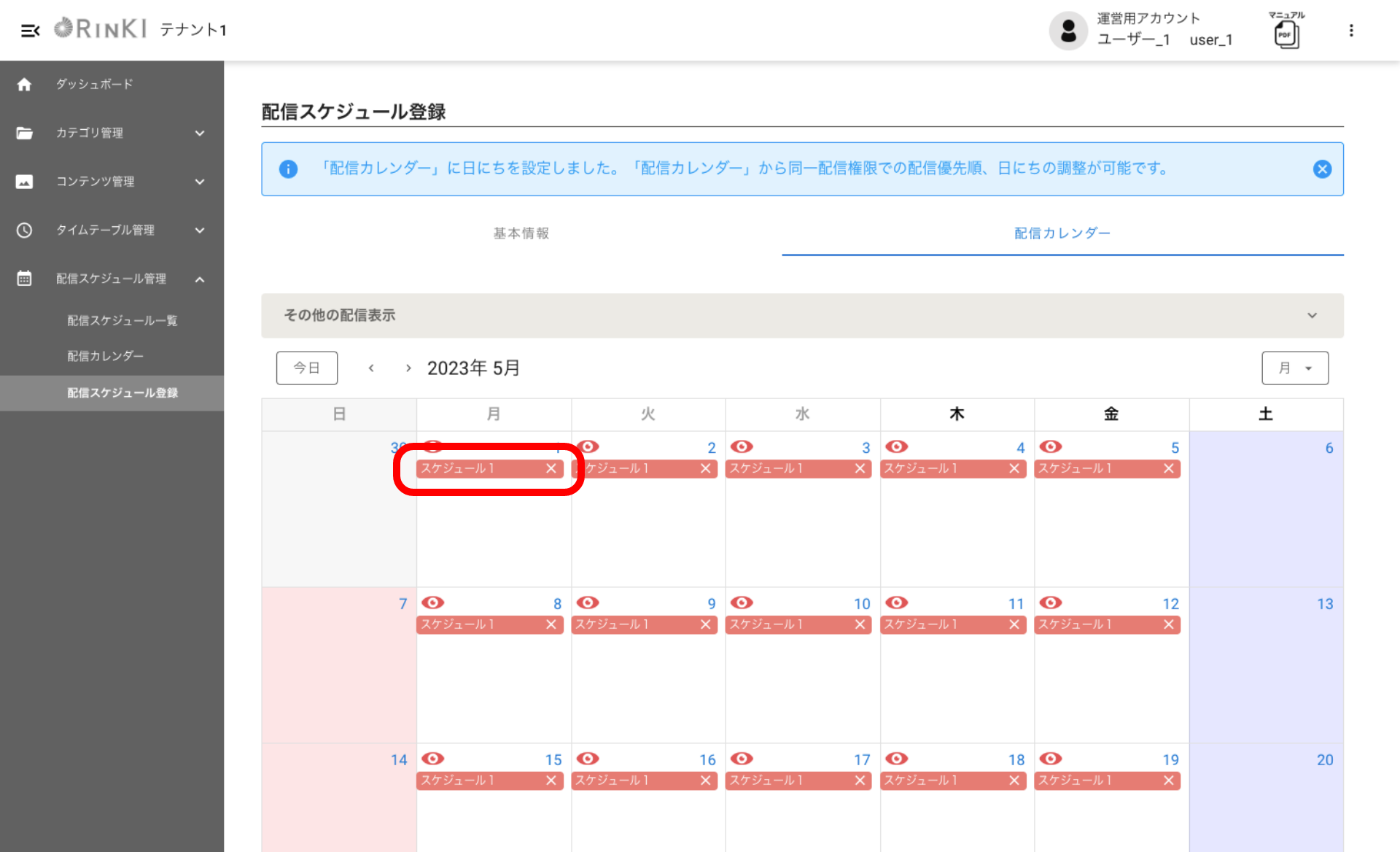 - 「配信カレンダーに設定」を選択で「配信カレンダー」に配信スケジュールが表示されます。