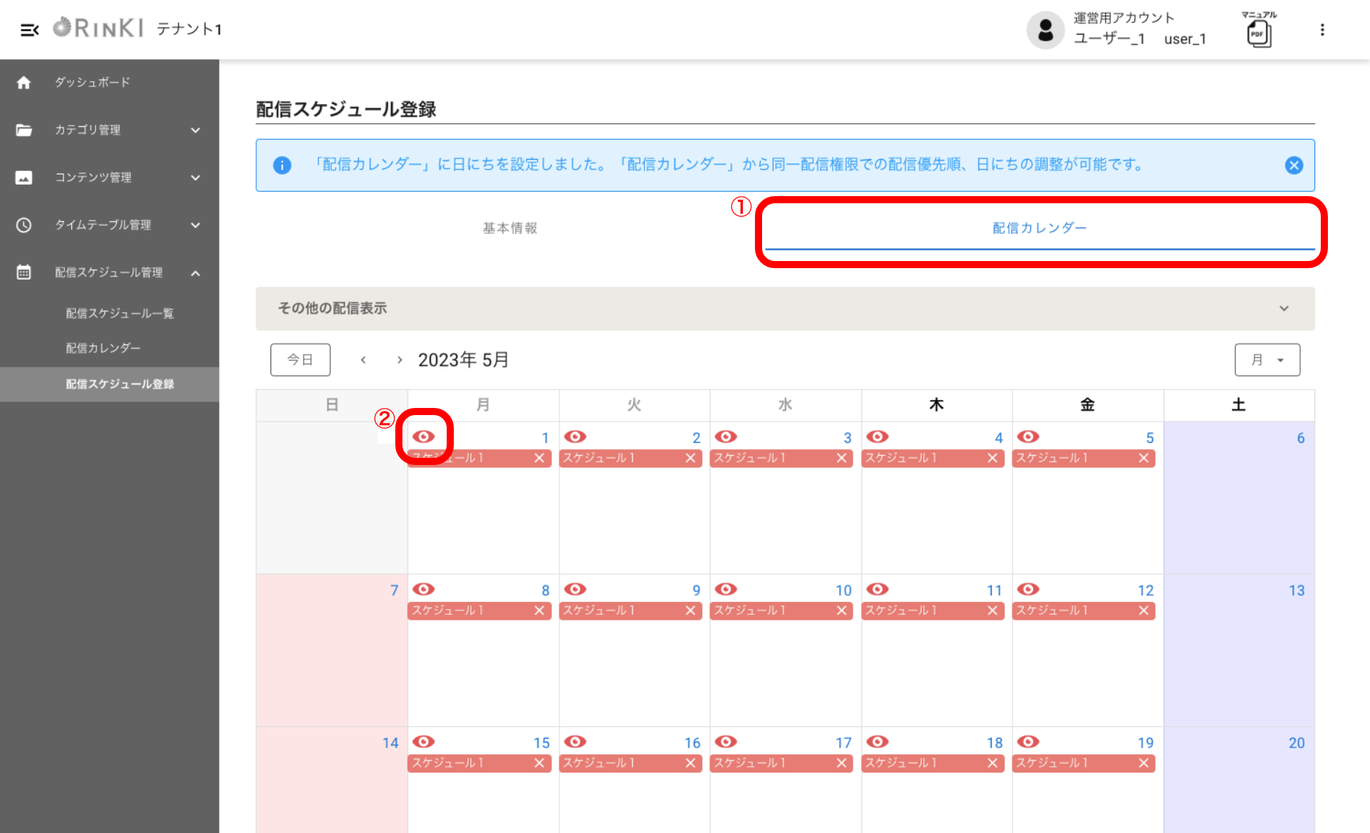 - ①:配信スケジュール登録にある「配信カレンダー」のタブを開きます。