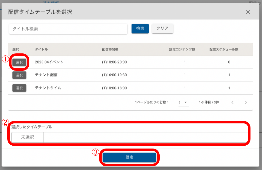 - ①:使用するタイムテーブルの「選択」を選択します。