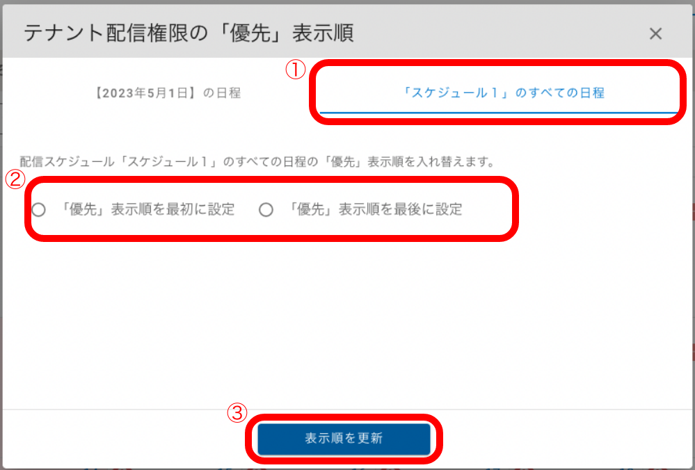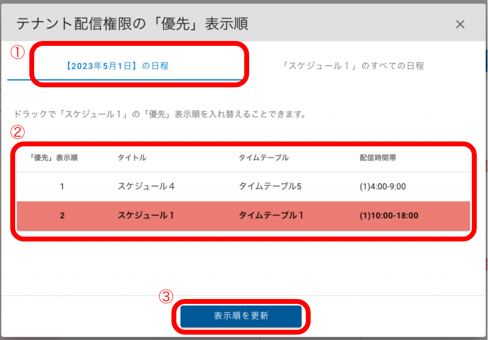 - ①:「【〇年〇月〇日】の日程」の同じ配信権限の優先度を変更します。
