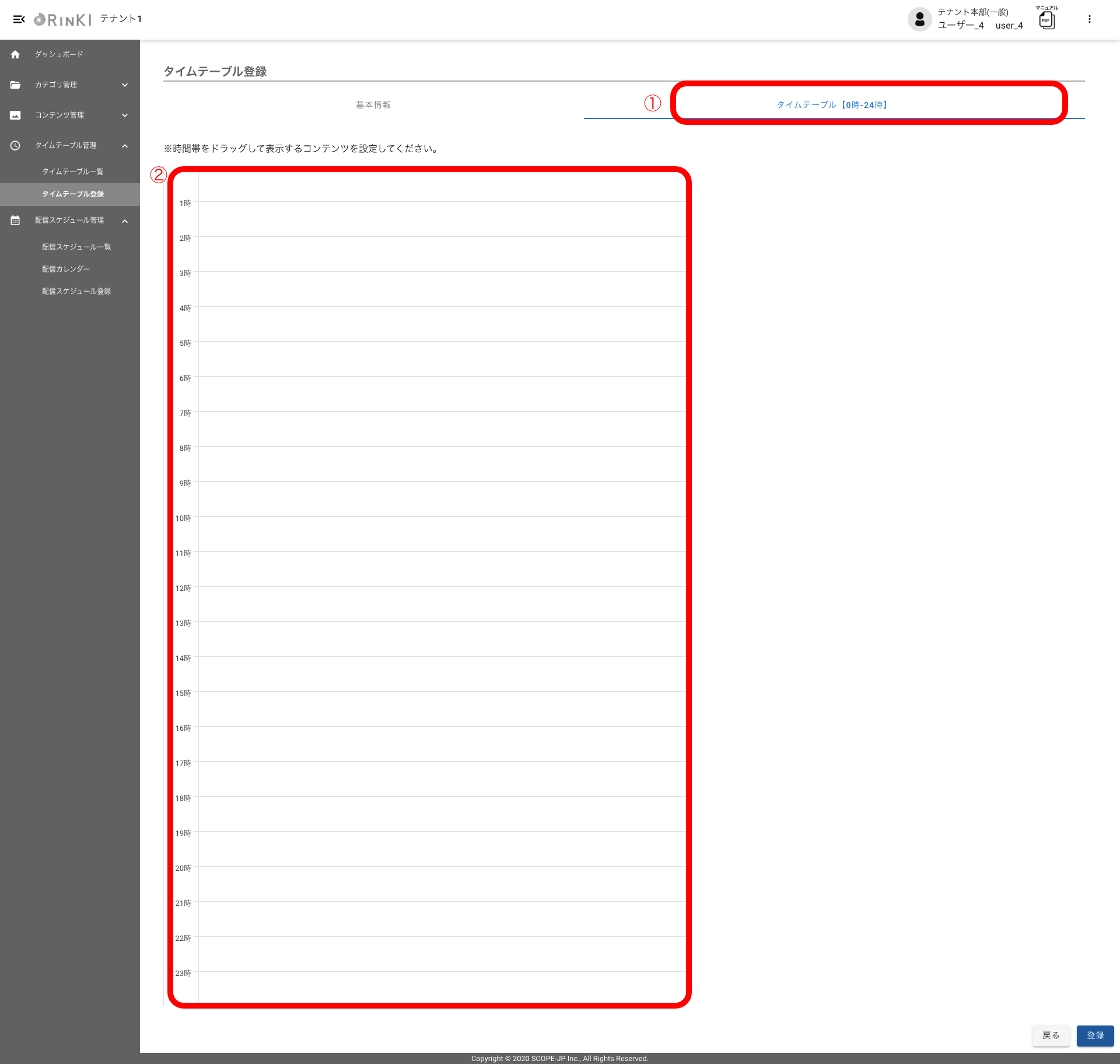 - ①:タイムテーブル登録にある「タイムテーブル【0時-24時】」のタブを開きます
