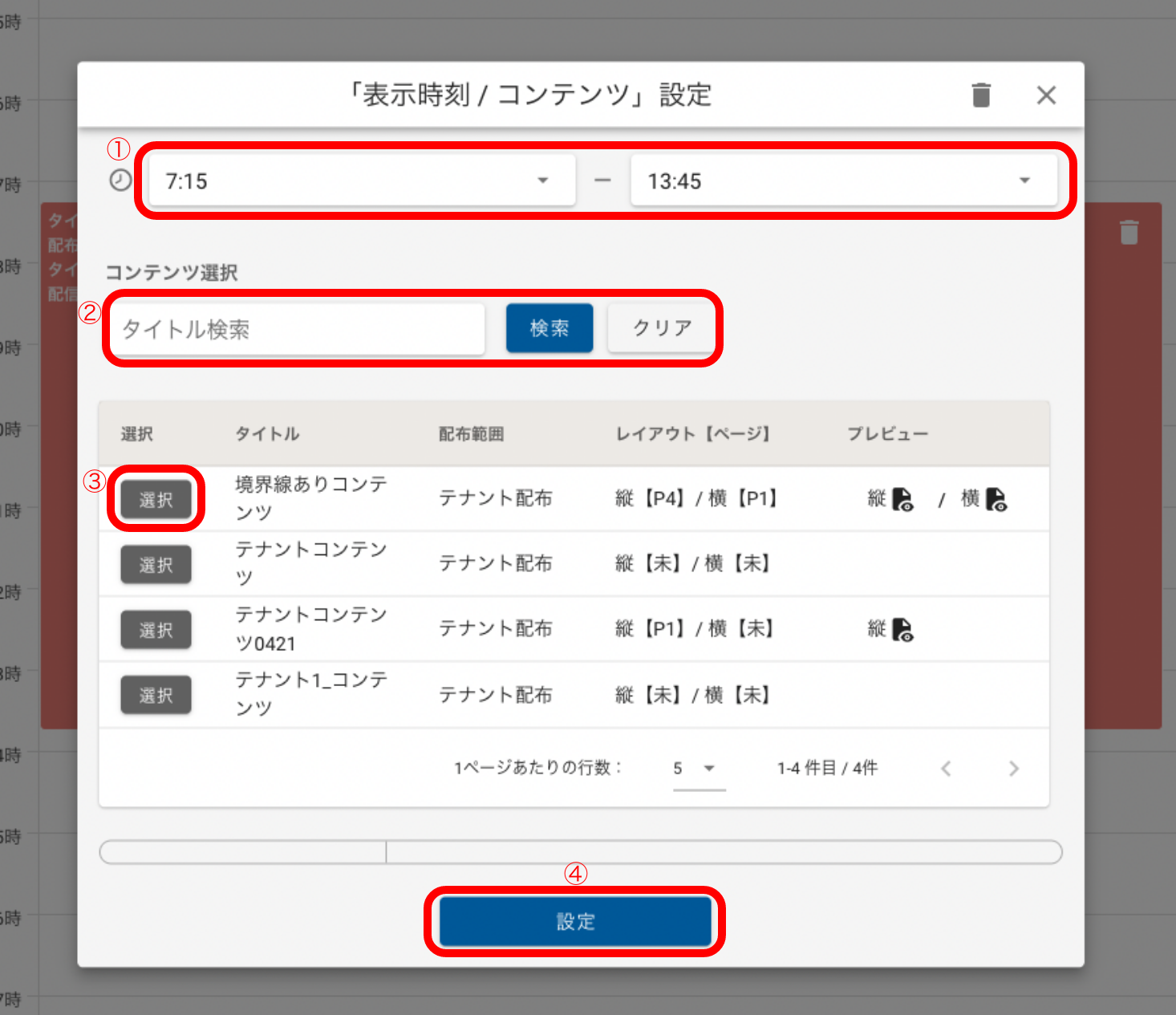 - ②:時間帯をドラッグまたは、選択すると「「表示時刻 / コンテンツ」設定」を開きます。