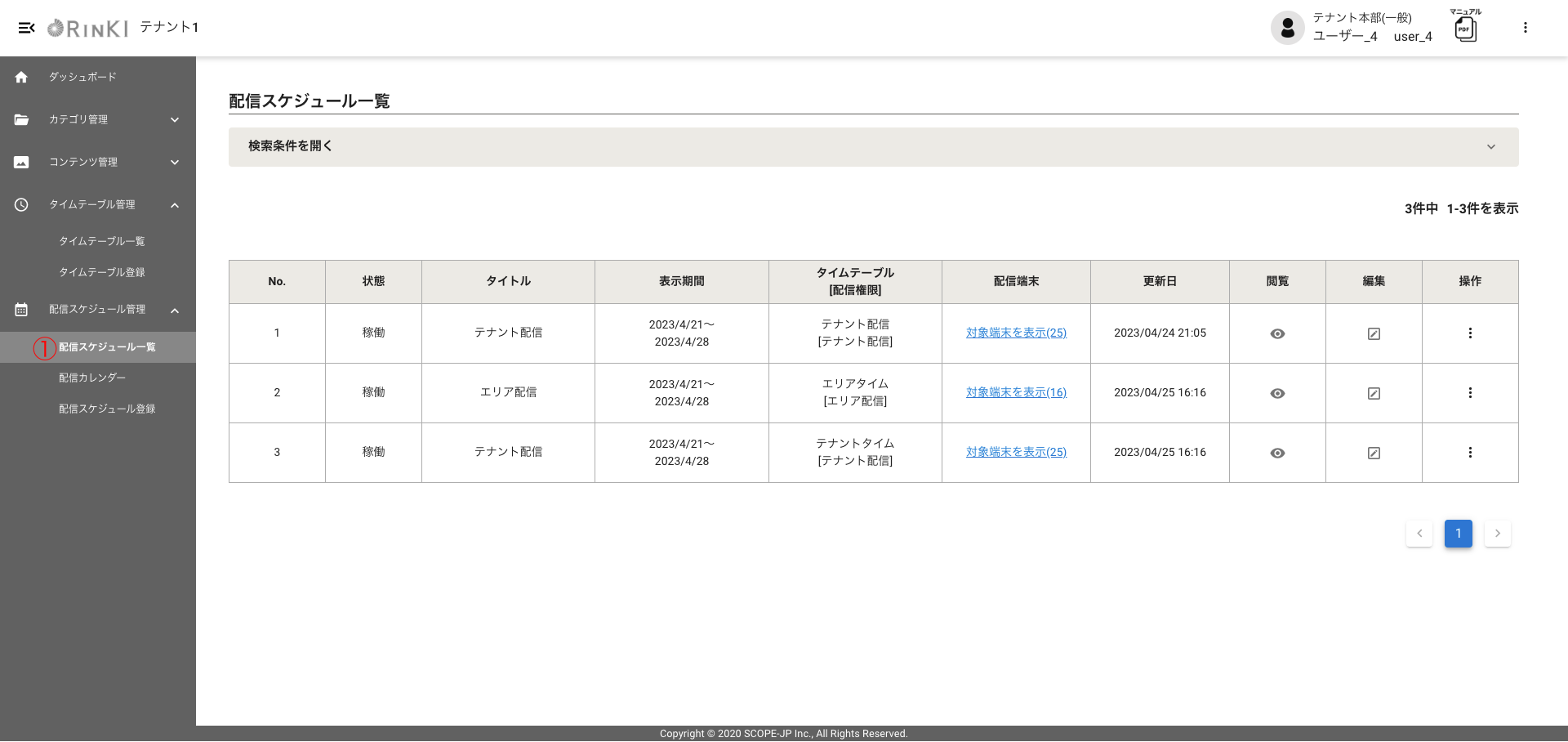 ・自信のエリアのエリア配信の配信スケジュール ・自信のエリアに属するグループ配信の配信スケジュール ・自信のエリアに属する現場(端末)配信の配信スケジュール |