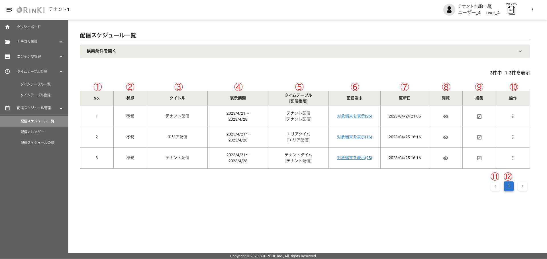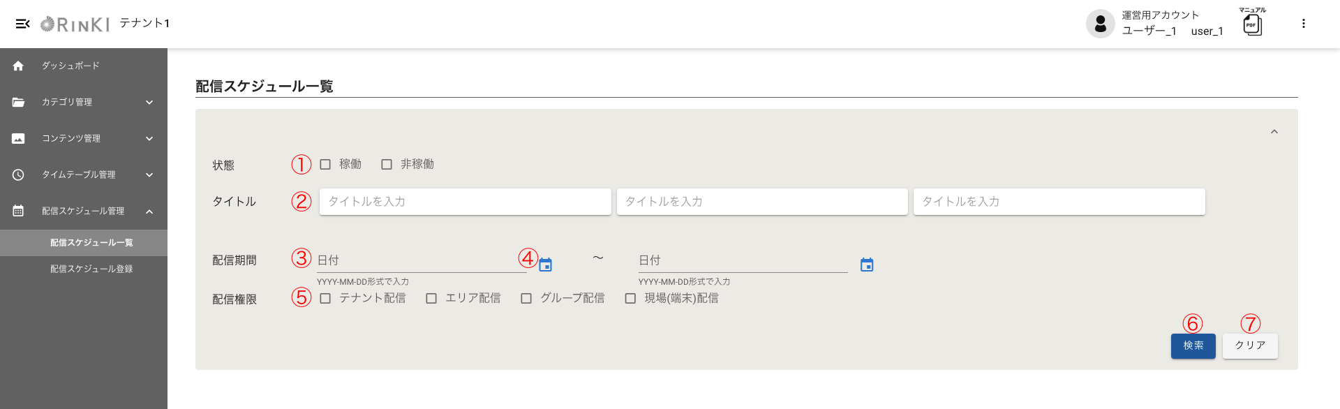 | ① | 配信スケジュール一覧 | リンク | 配信スケジュール一覧に遷移します |