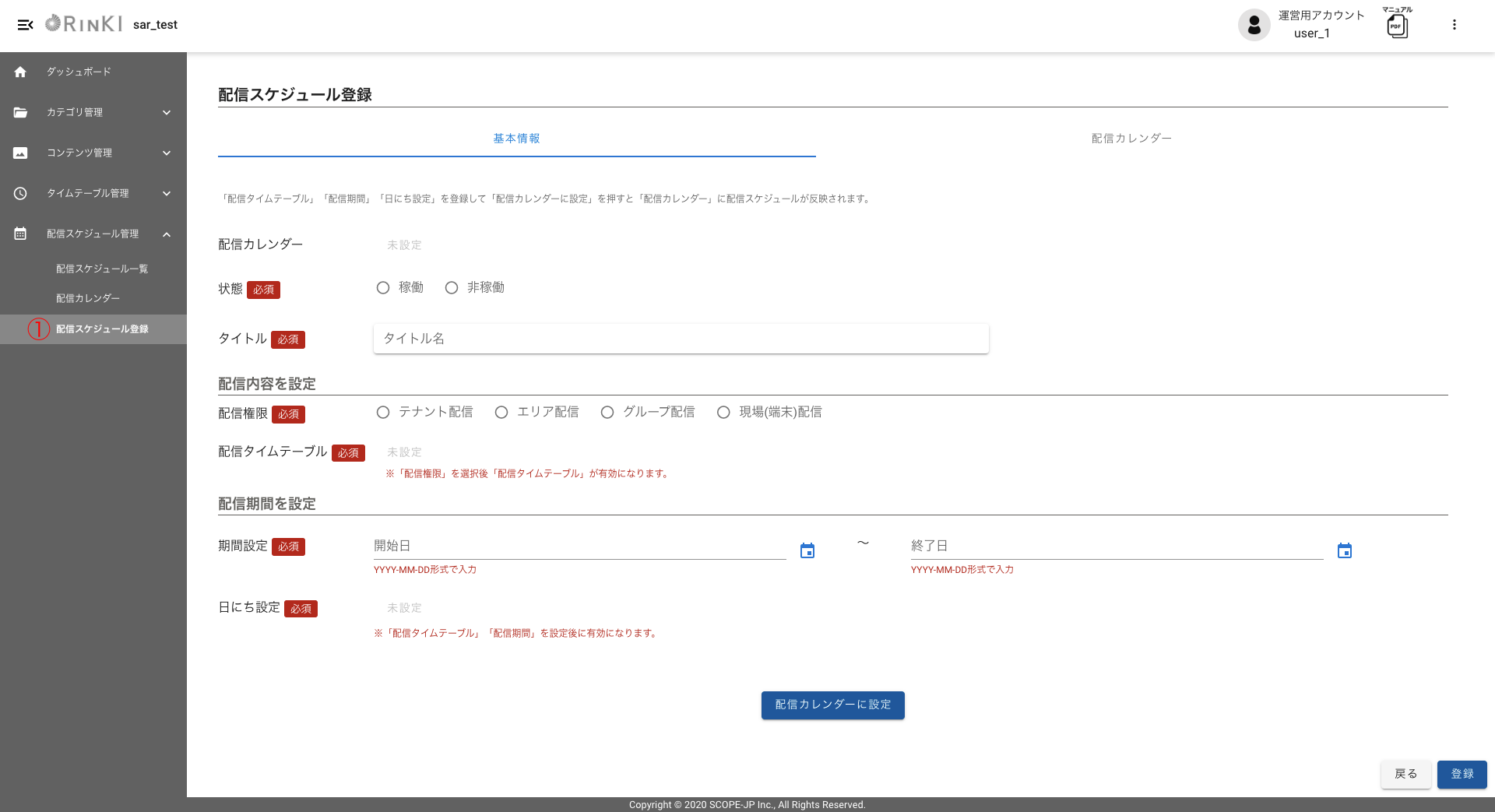 | ① | 基本情報/配信カレンダー | ラジオボタン | ||