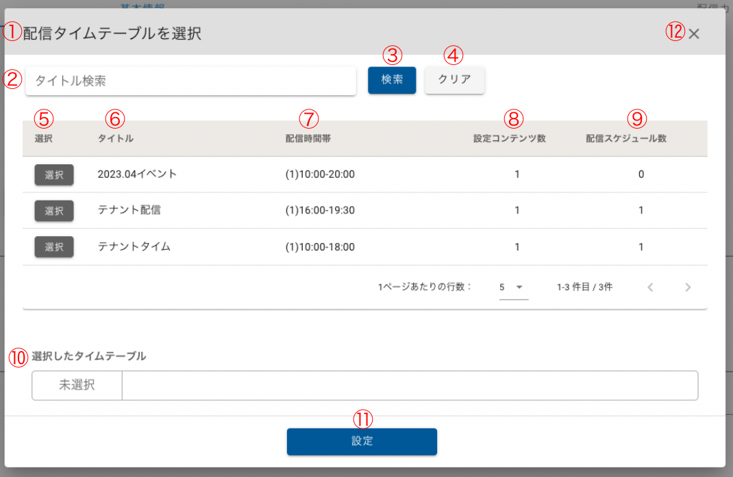 | ⑩ | 選択したタイムテーブル | テキスト | タイトル/配信時間帯 | |