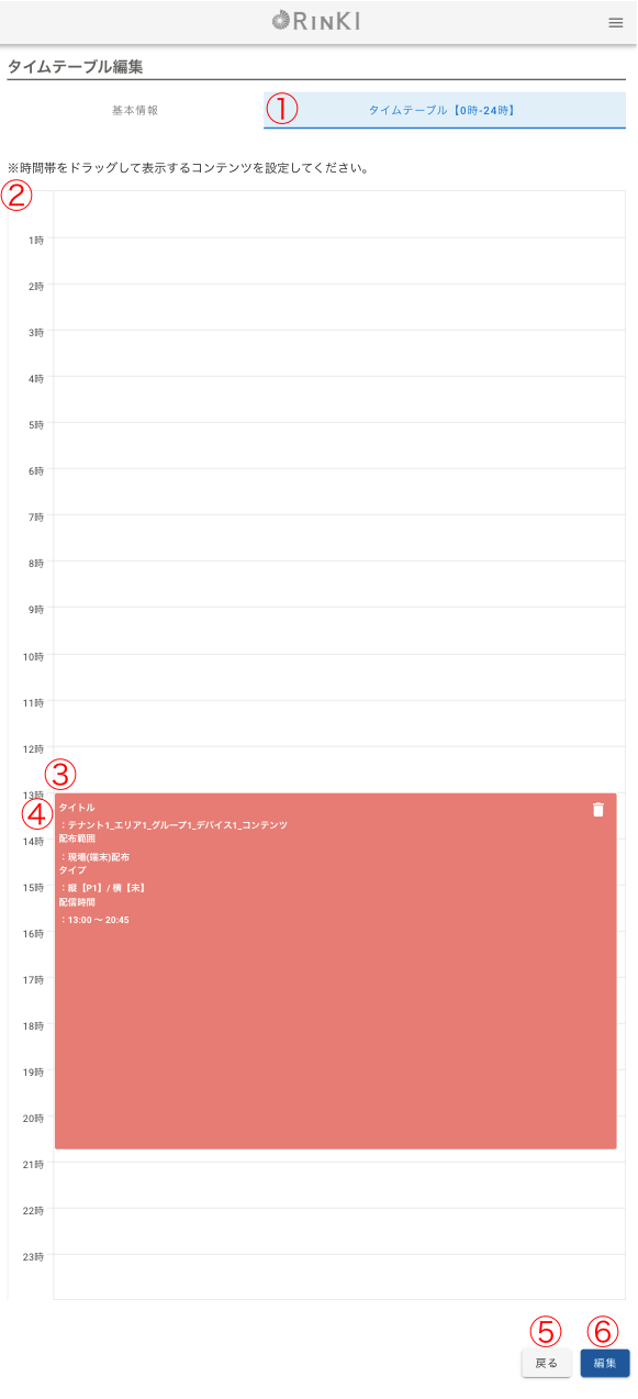 | ① | タイムテーブル【0時-24時】 | タブ | ||