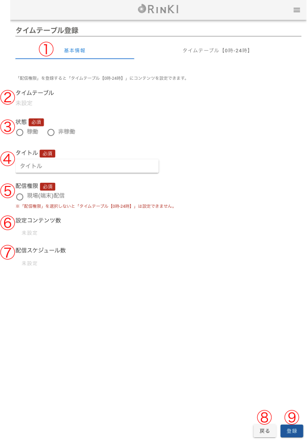 | ⑤ | 配信権限 | ラジオボタン | 0:テナント配信 1:エリア配信 2:グループ配信 3:現場(端末)配信 |