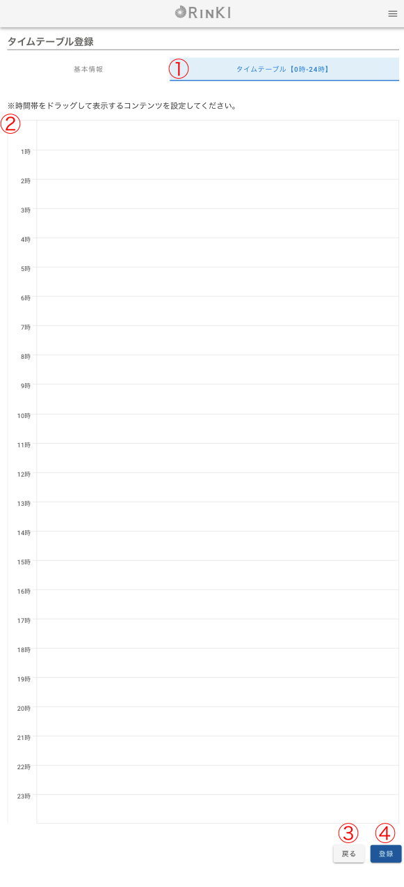 | ① | タイムテーブル【0時-24時】 | タブ | ||