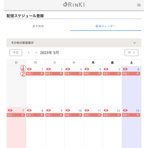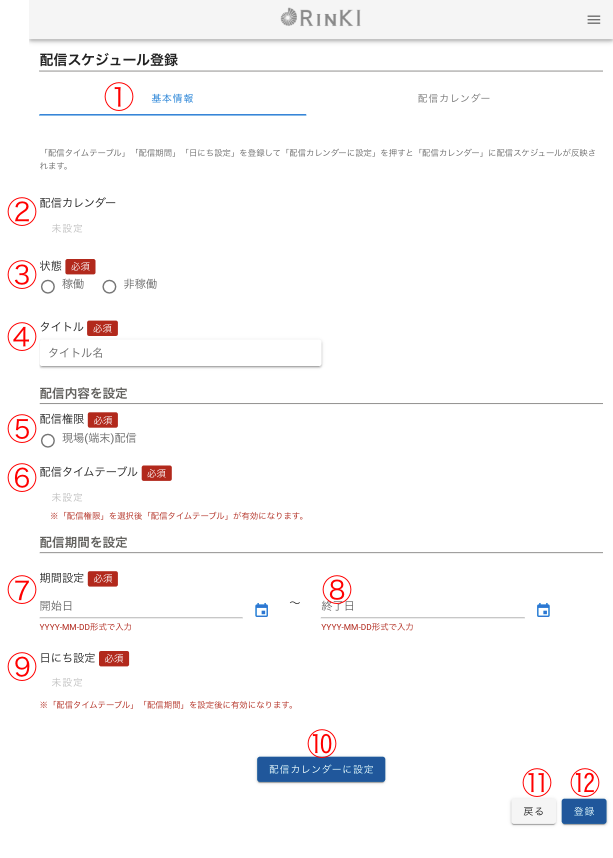 | ⑩ | 配信カレンダー設定 | ボタン | 設定したスケジュールを配信カレンダーに反映させる。 | |
